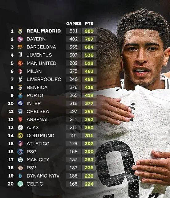 上个赛季结束时,欧冠历史总积分榜出炉。尽管巴黎圣日耳曼夺冠,但由于历史较短,他们的总积分仅为300分。而榜首当然是皇家马德里,他们当时拥有985分。本赛季初,皇马2:1战胜马赛,积分增至988分。